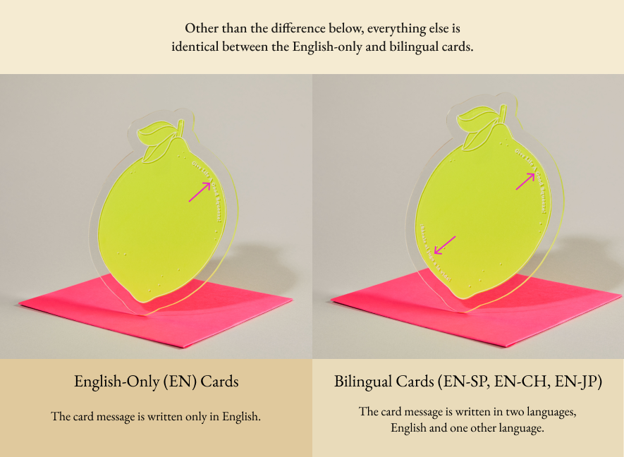 Just like other YS Notes delights, our bilingual lemon cards come in multiple languages, giving you the chance to share zesty delight with other adventurous friends, wherever they may be. Choose your favorite bilingual card from our options of English, Spanish, Mandarin and Japanese to best express your zest!