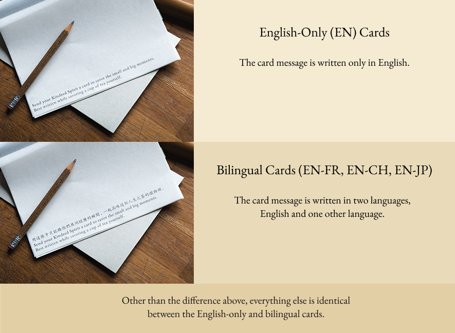 Light Kindred Spirit cards are available for purchase with English-only messages (EN), or with bilingual messages in the following language combinations: