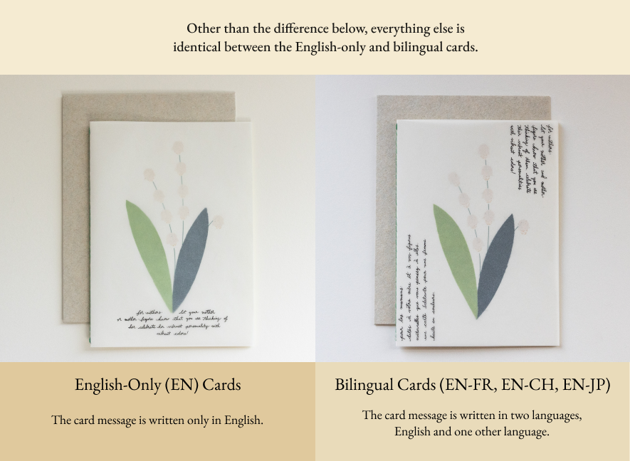 Mothers' cards can be purchased with an English-only (EN) message, or a bilingual (EN-FR, EN-CH) message. Please see below "Language & Translations" for more details.