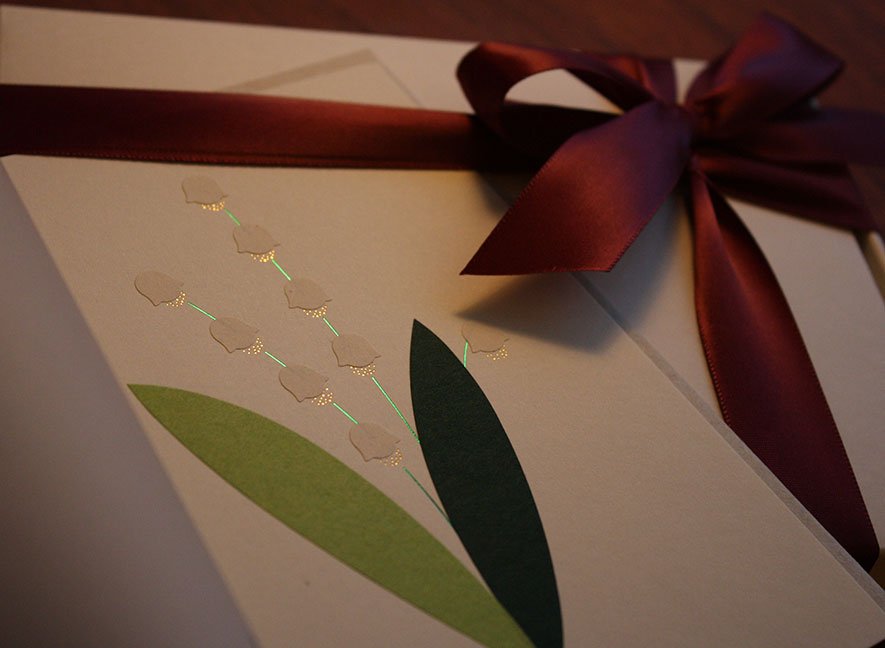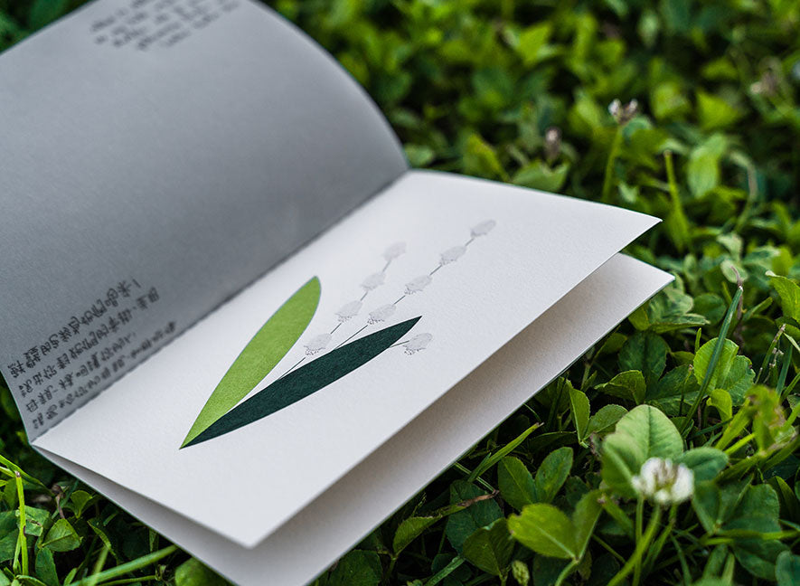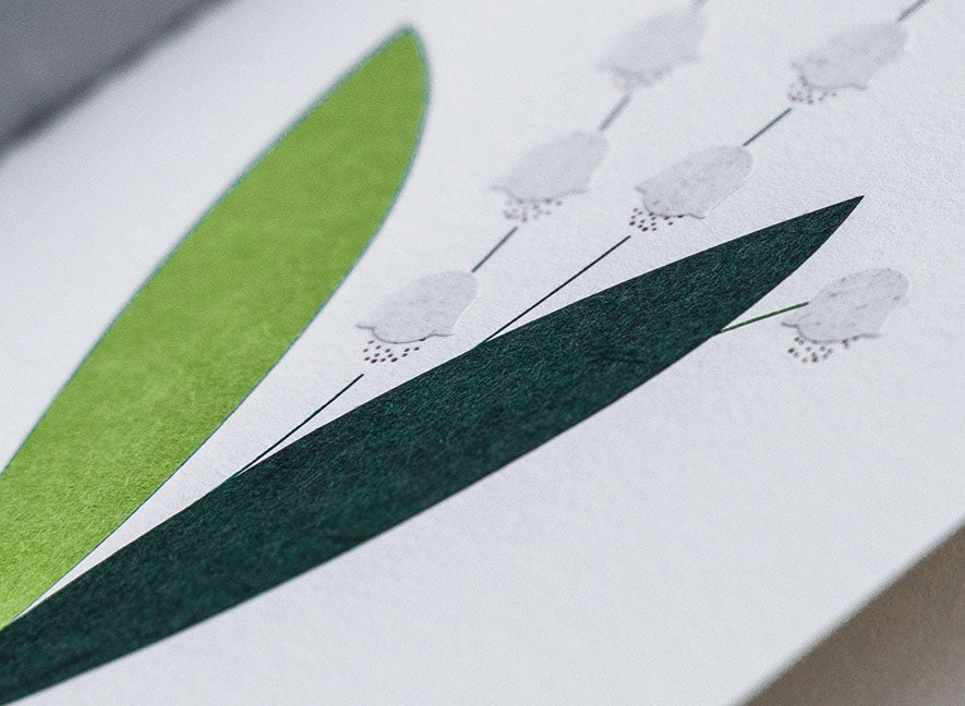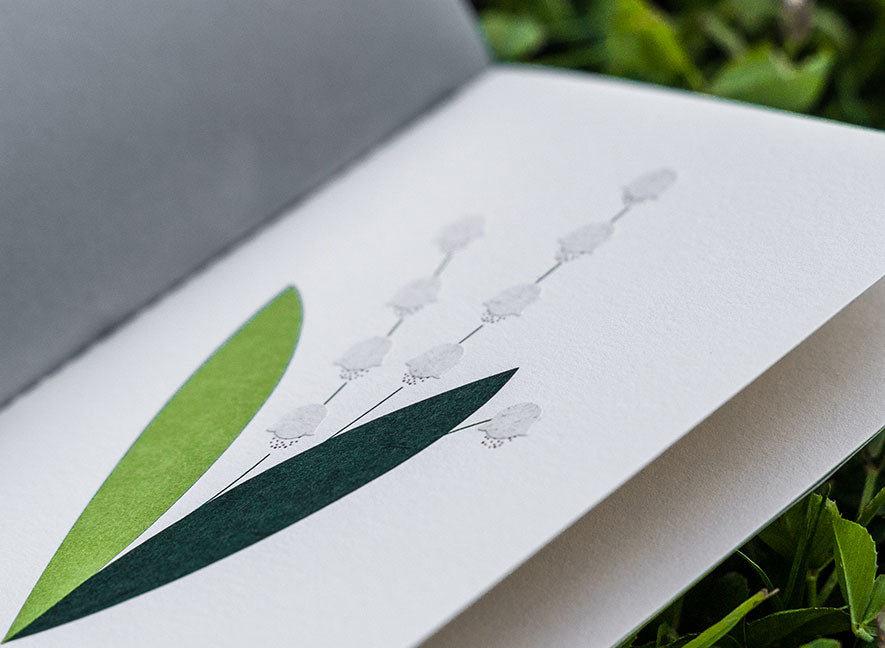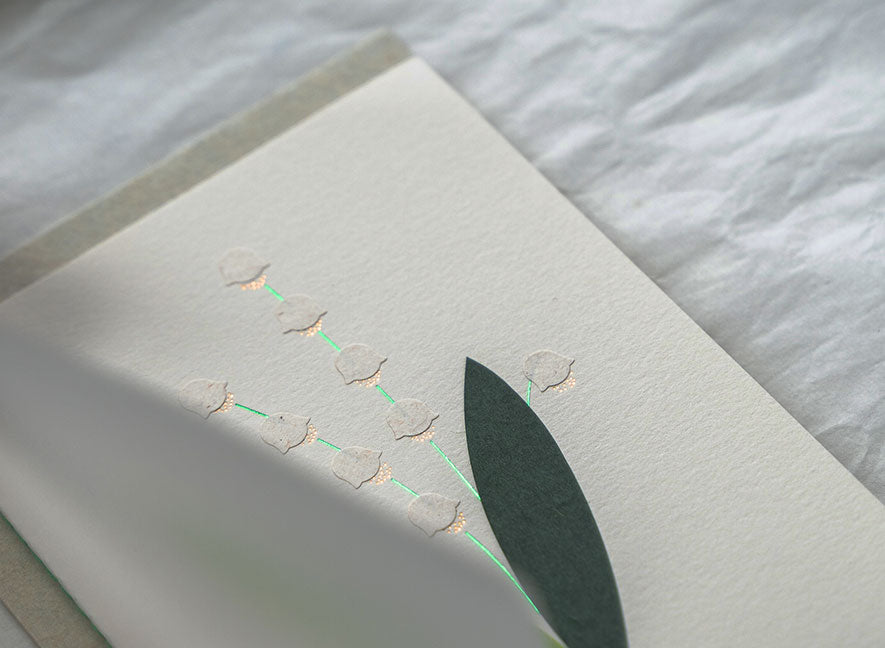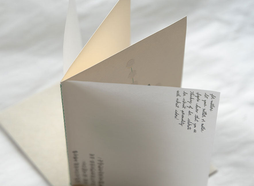 Our two-ply Mothers' card was originally sketched with vintage postcards and lilies-of-the- valley in mind. Tracing paper with handwritten phrases is layered on top of cotton paper underneath, on which flowers and leaves have been individually applied and metallic ink creates additional contours.