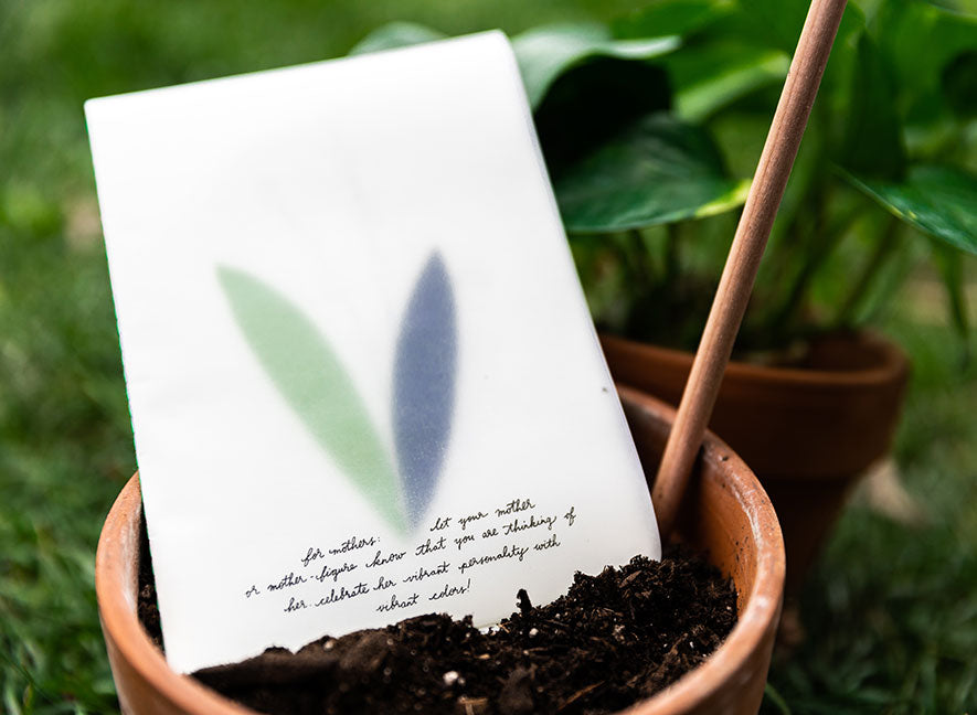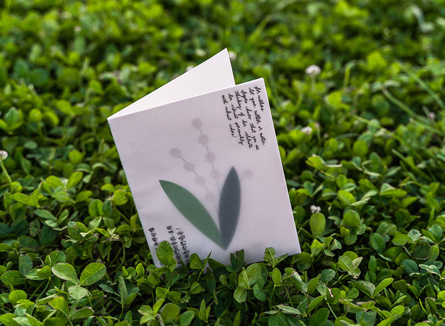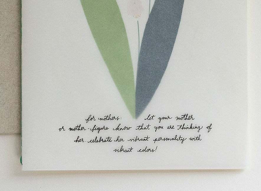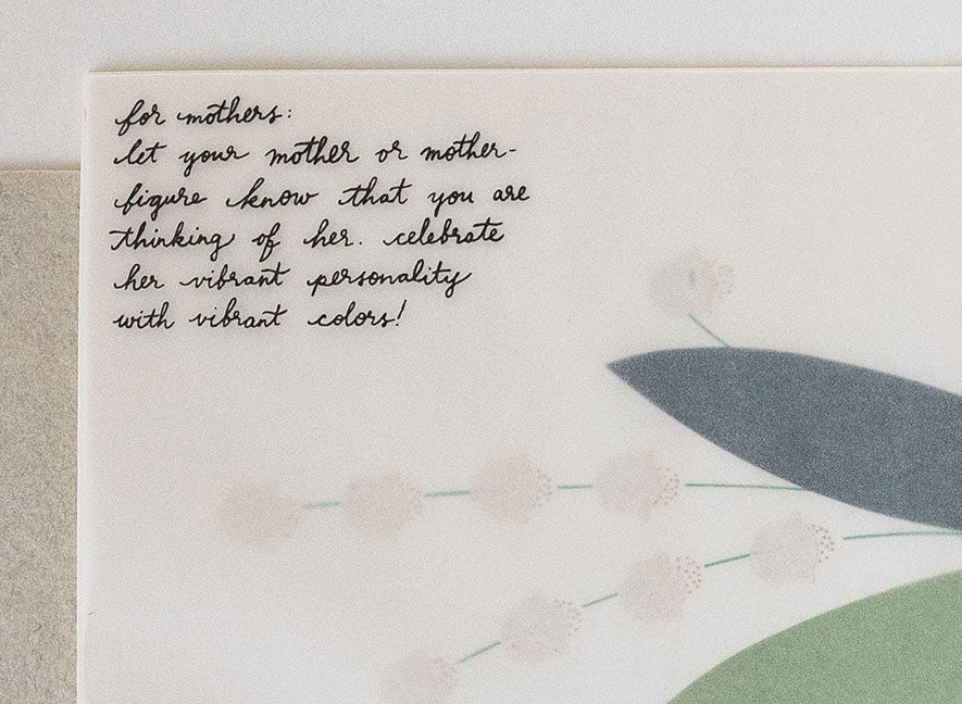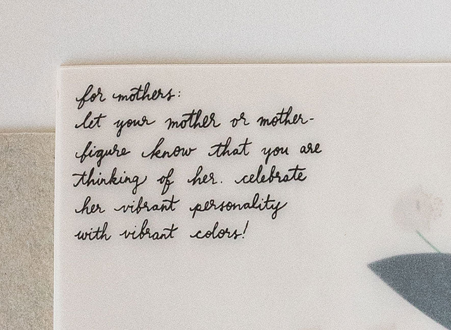 We love the translucent tracing paper used in this card, and the way it ages. Smooth to touch, the tracing paper lightly absorbs humidity and naturally crinkles over time with age - giving our Mothers' card a well-loved, comfortable feeling as time passes.