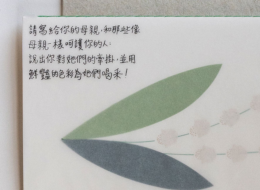 (CH) 請寫給你的母親,和那些像母親一樣呵護你的人: 說出你對她們的牽掛,並用鮮豔的色彩為她們喝采.