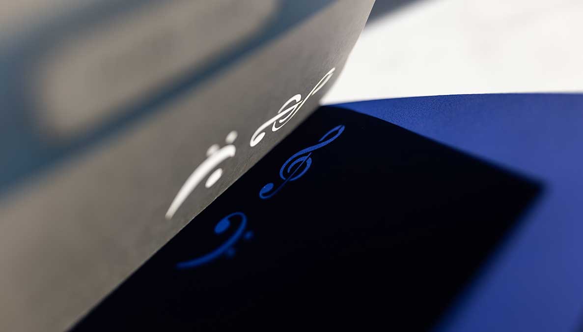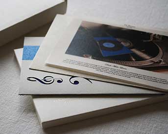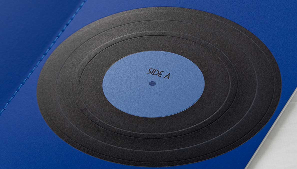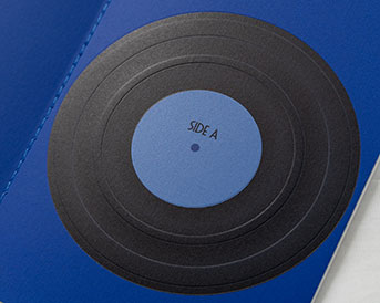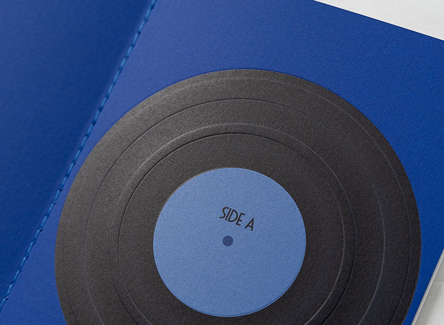 We use an electric blue cardstock as our base material to recreate the feel of a vinyl record. We then go through several applications of high pressure to achieve the desired relief we want - creating distinct contours in the card. The result is a smooth and groovy experience.
