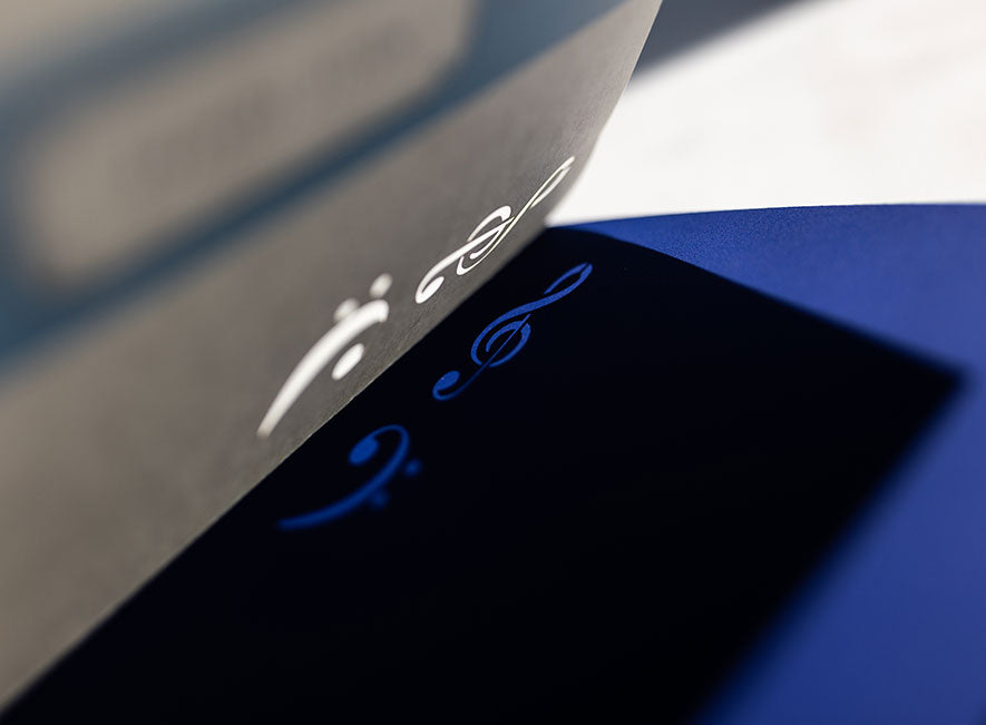 - Laser Cut Details: The treble and base clef on the white outer layer of the two-ply card has been cut out by laser to achieve design precision.