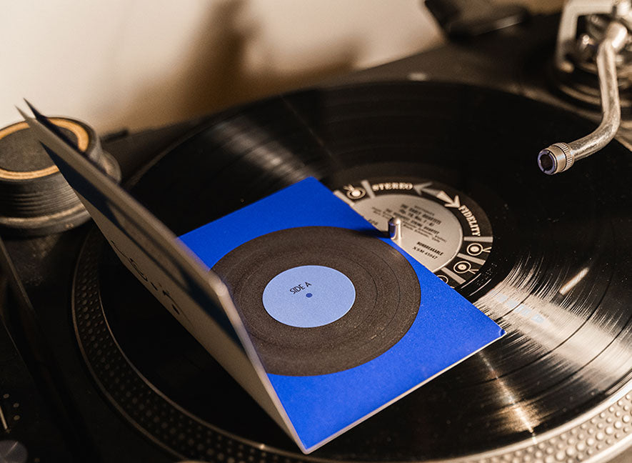 Our dark music lovers' card is an homage to the aesthetic beauty and experience of listening to a vinyl record. How a record is played can lend a different quality of sound and experience. Touching the letterpress grooves inside of this card is great fun as it reminds us of picking out our favorite records and rediscovering familiar sounds. Using electric colors and smooth surfaces, this card is perfect for anyone who likes writing letters on both the A-side and B-side.