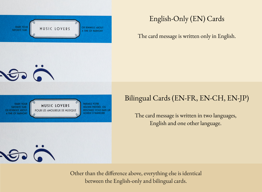 Music Lover cards are available for purchase with English-only messages (EN), or with bilingual messages in the following language combinations: