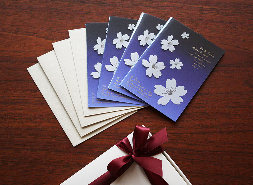 Each Seasons Collection Box includes four Dark Seasons cards in the language pairing of your choice, and four mailing envelopes. These cards will be collectively wrapped and sealed within our signature cream box and gift wrapped with a satin ribbon.